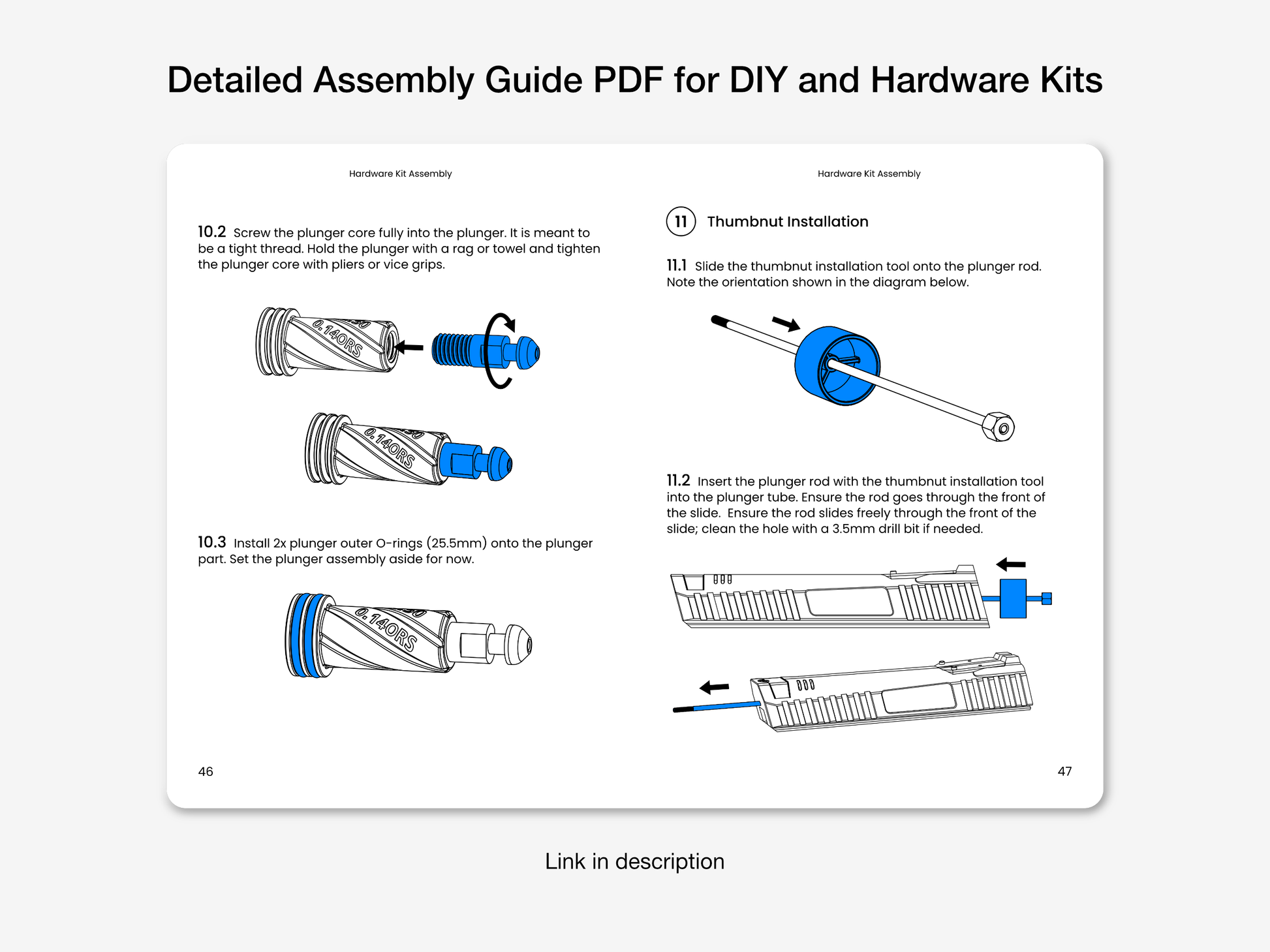 Hardware components only - no printed parts. The only printed part included is the plunger - done in PETG with a TPU face to protect against ware. This Hardware kit can make any of the 9 possible configurations with different muzzle and handguard variants, just choose the barrel length for your desired configuration (see image 4). All Zinc .50 kits include 9x BCAR pins and bearings. The included mag springs can make 4x 7 dart or 2x 8-13 dart magazines