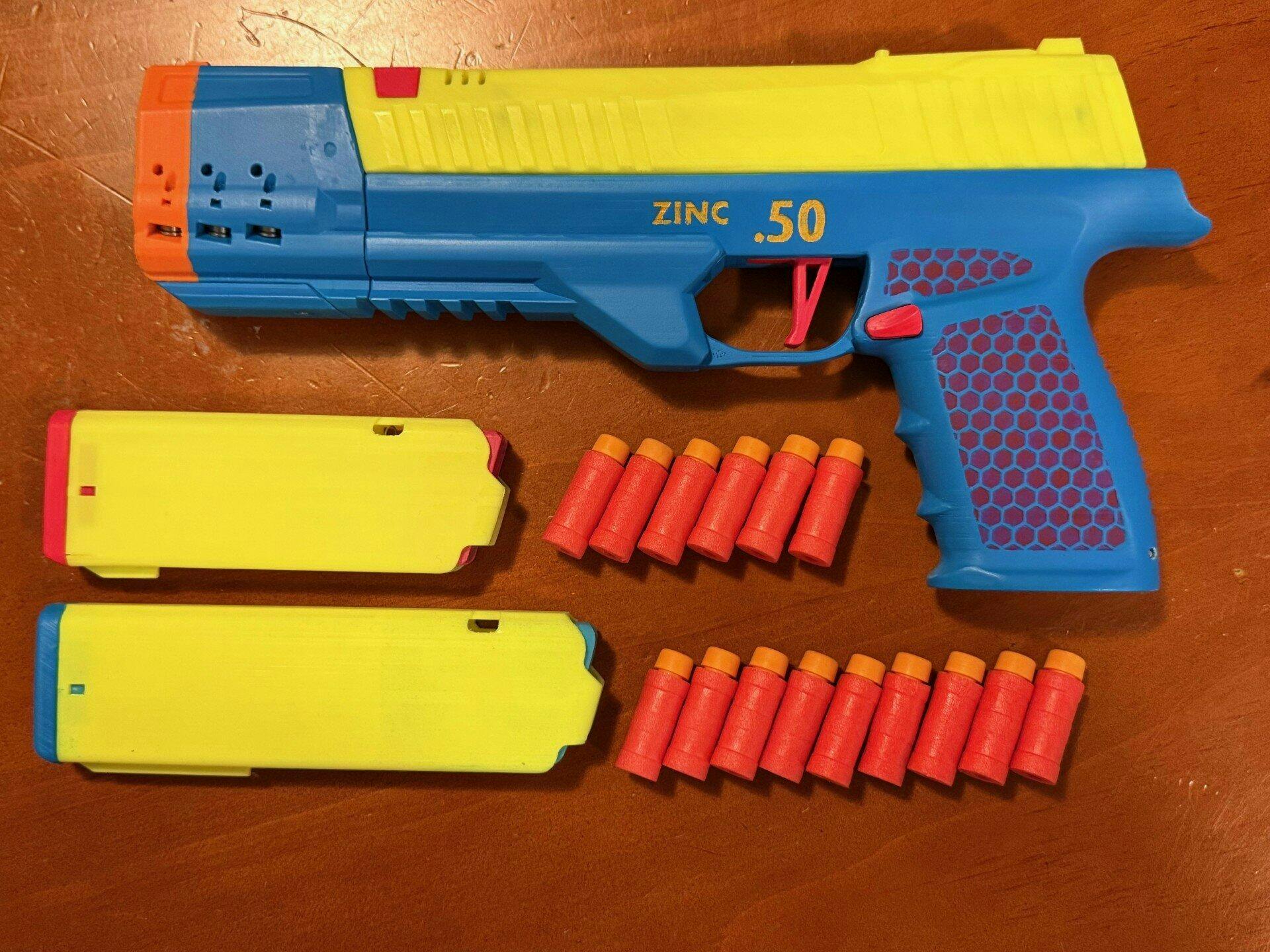 The Zinc .50 is a high-powered, mag fed (7-13 dart capacity) foam dart springer pistol blaster capable of up to 250 FPS muzzle velocity for 205mm barrel configurations, and up to 230 FPS for 160mm barrel configurations. See images for further details.