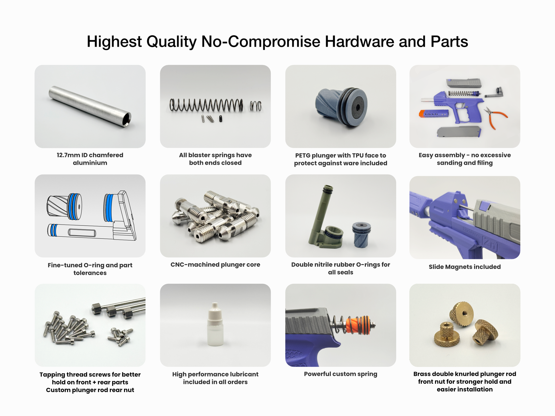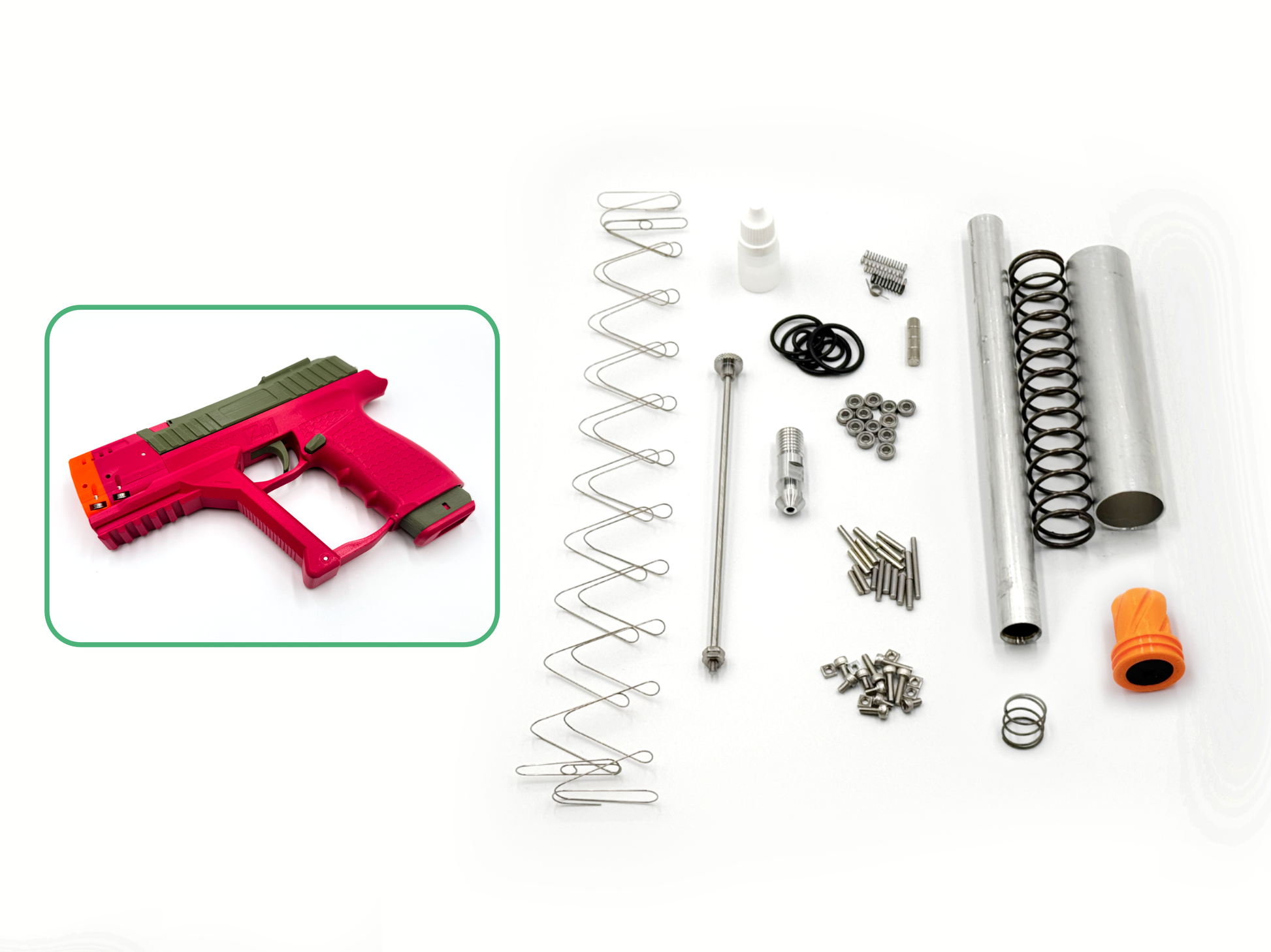Hardware changes include a tighter-toleranced aluminum plunger tube over the original polycarbonate one, refined closed-end springs for all springs to fix issues of the original Zinc such as the stiff catch and weak mag release, double O-rings on all seals, lubricant oil included, plastic tapping screws replacing machine screws with nuts (caused part splitting or the nuts would turn in place, making removal impossible), and more.